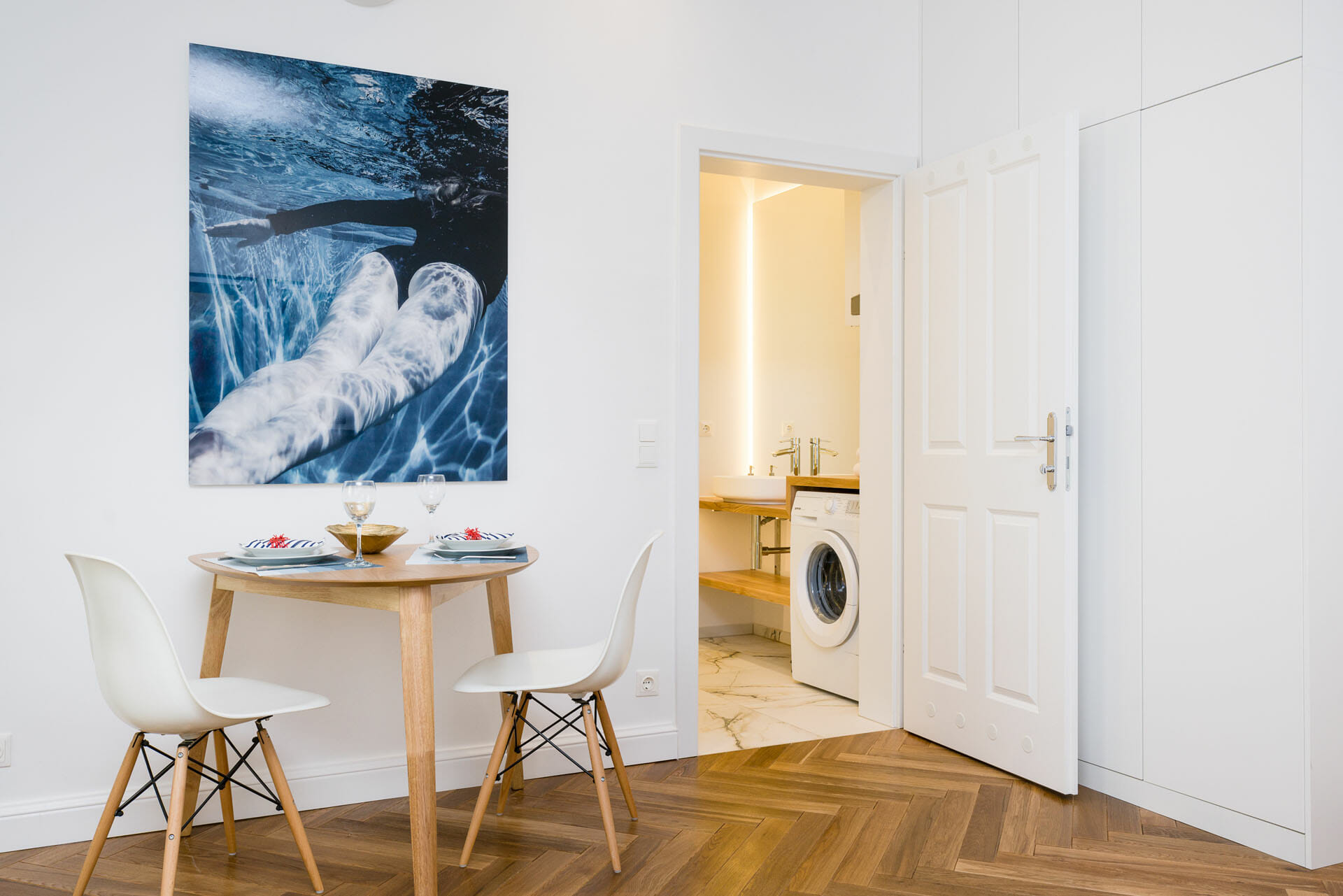This beautifull Studio Apartment has been designed and furnished by our own interior designer with individual pieces. It is equiped with a 55inch Samsung UHD curved smart TV. The bathroom is very bright and smart and Comes with a washing machine. Vienna Prestige is one of the leading Providers of high end furnished stylish serviced Apartments in Vienna in Top Locations at great value for Money.